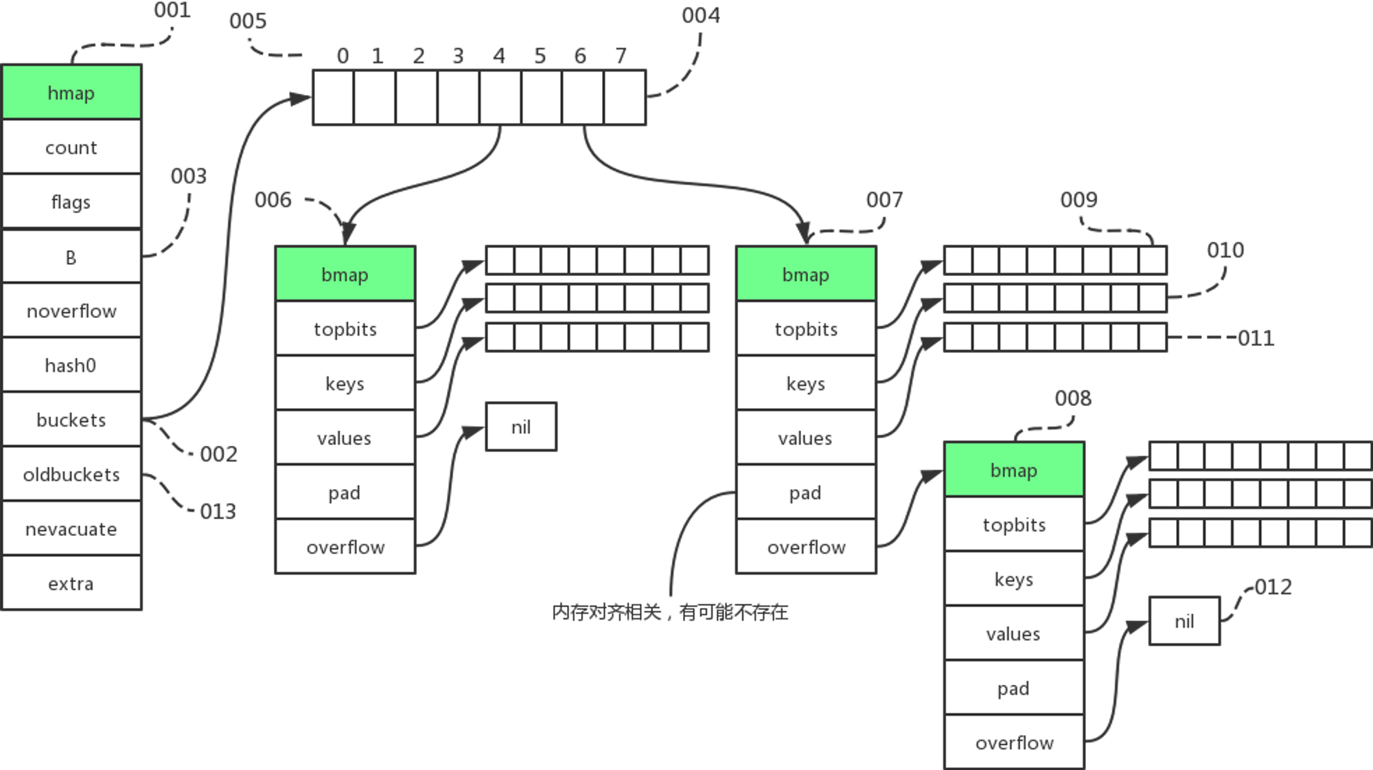 第二个问题,虽然在源码中,我们看到的bmap结构体只有一个tophash字段,但实际不止这一个,有些字段是动态加入的: